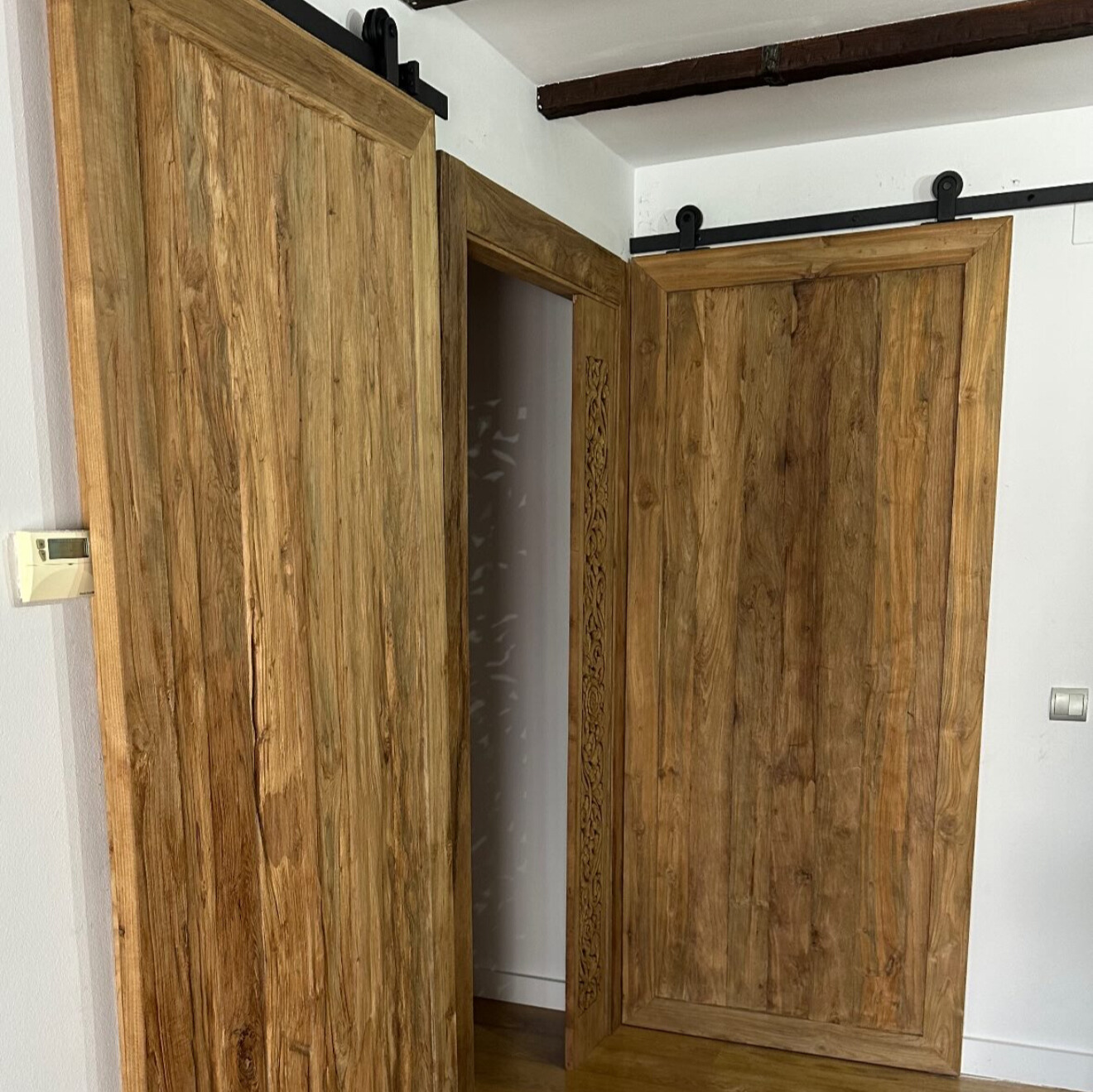 Handcrafted teak sliding door to bring lightness, intimacy and harmony to the space. Its natural lines and the delicate interplay of the wood evoke the calm of traditional Silk Road interiors, transforming the bathroom into a haven of serenity and balance.