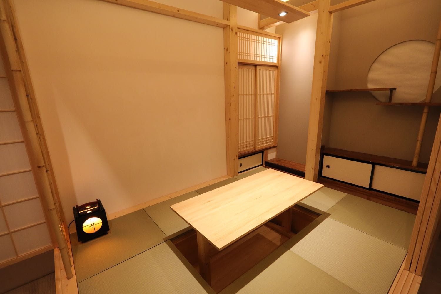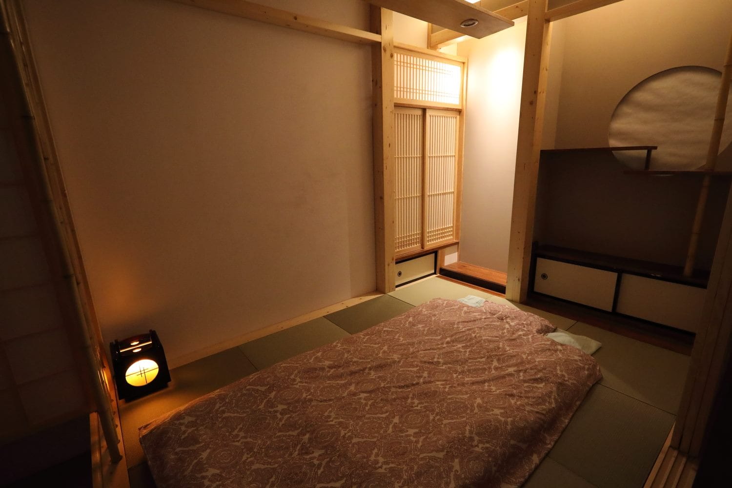 Está diseñada y creada de forma polivalente donde el espacio se convierte en sala de té, comedor y también habitación. Al más puro estilo Ryokan.