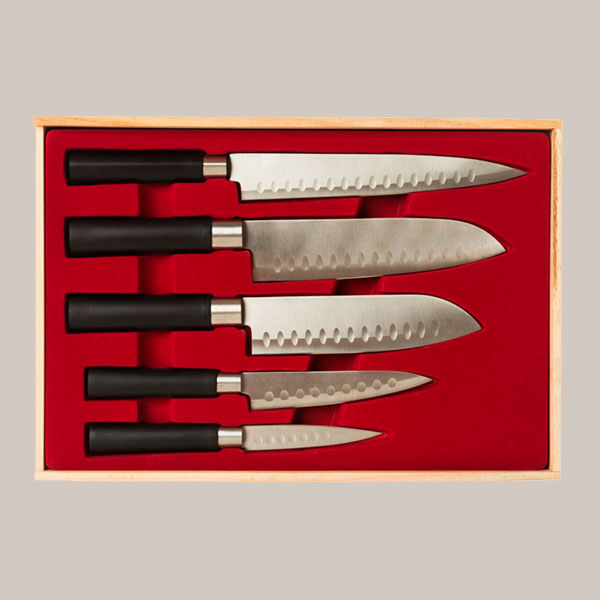 Este set de cinco cuchillos japoneses reúne lo mejor de la forja artesanal nipona: equilibrio perfecto, ligereza y un filo incomparable. Cada cuchillo ha sido diseñado para una función específica —desde filetear pescado hasta cortar verduras con precisión— convirtiendo el acto de cocinar en un verdadero ritual.